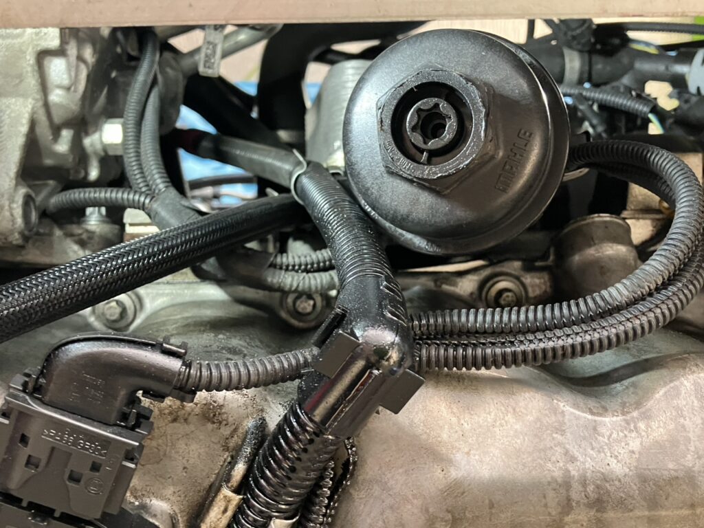 写真では見えませんが太い冷却水ホースの下あたりに今回交換するオイルフィルターハウジングがあります。