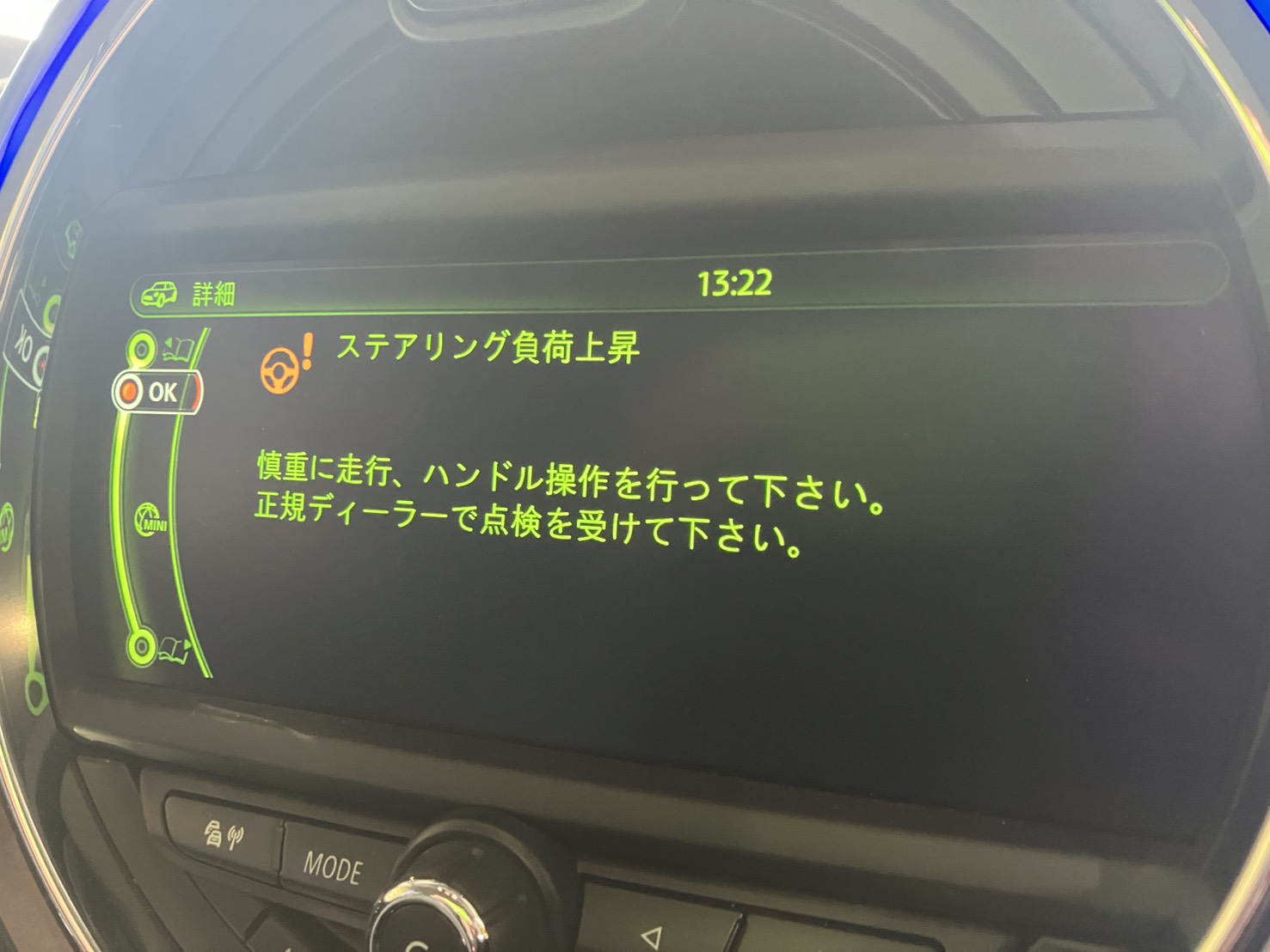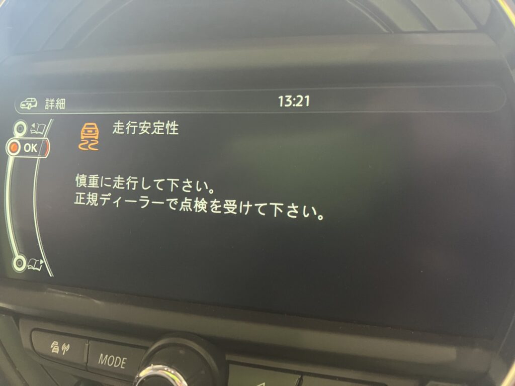 パワステが効かないのと同時にセンターディスプレイには「ステアリング負荷上昇」と「走行安定性」の表示が。